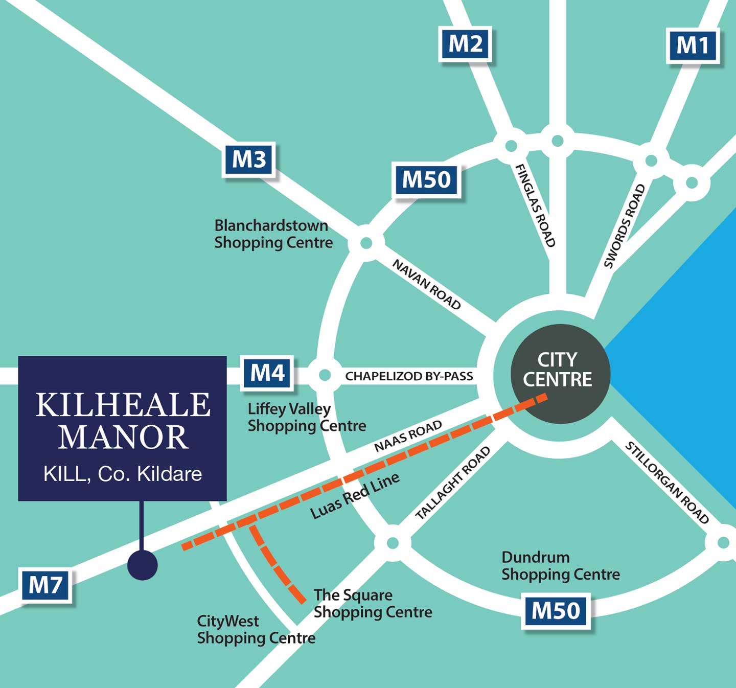 From Dublin take the N7 (Naas / Limerick Road). Take exit 7 signed Kill / Straffan. Take second exit off roundabout sign posted for Kill and continue straight ahead past the new school. Approach next roundabout and take second exit and continue straight ahead. Continue past Euro Spar and take the next left across from the Dew Drop (Bar & Restaurant). Continue straight ahead and Kilheale Manor is 200 meters up on your left hand side.